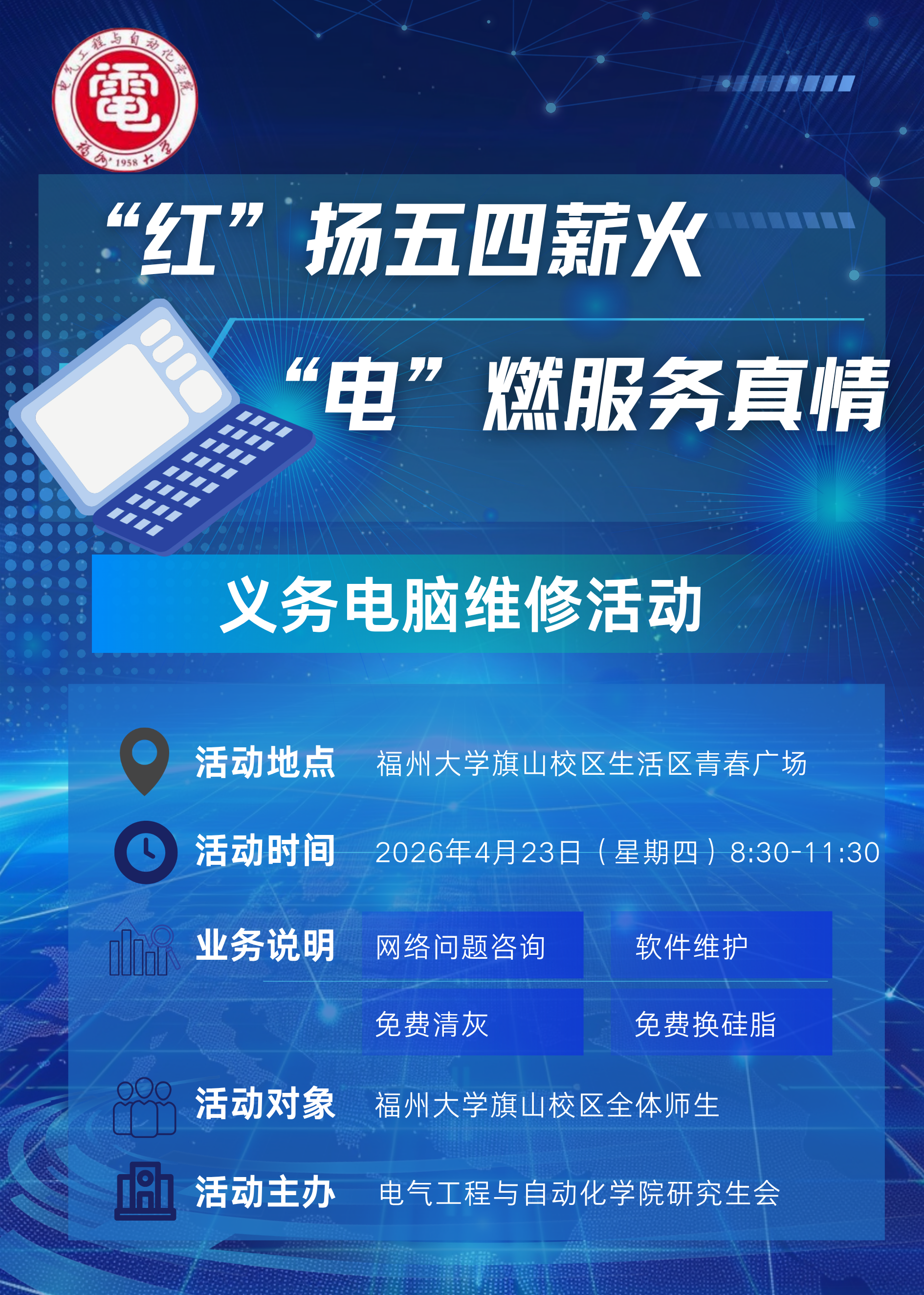 为传承五四薪火,服务全校同学,解决同学们日常学习科研中遇到的电脑使用难题,91色情研究生会将于4月23日(星期四)上午8:30至11:30,在青春广场举办“红”扬五四薪火 ,“电”燃服务真情义务——义务电脑维修活动。