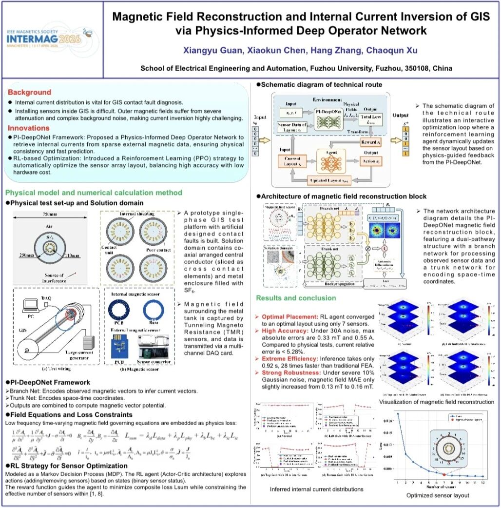 在INTERMAG 2026会议上,关向雨副教授展示了最新研究成果,论文题目为《Magnetic Field Reconstruction and Internal Current Inversion of GIS via Physics-Informed Deep Operator Network》。该研究融合物理模型与深度学习方法,为气体绝缘开关设备内部状态的非接触式诊断提供了新思路。INTERMAG是国际磁学领域最具影响力的顶级学术会议之一,议题涵盖先进磁性材料、自旋电子学、生物磁学以及电力系统磁测量等多个前沿方向。